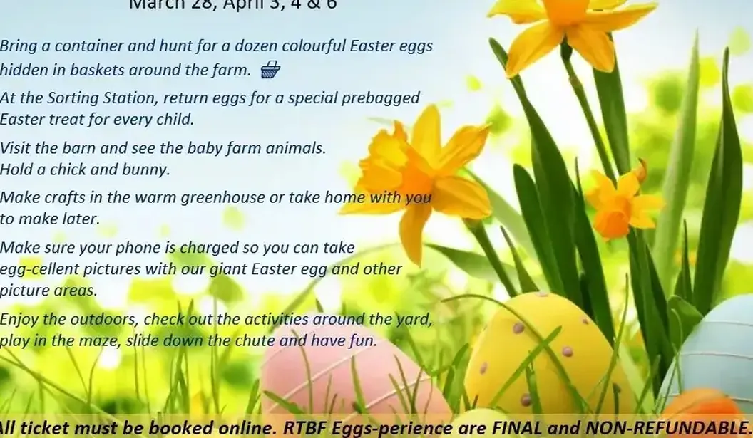 Bring a container and hunt for a dozen colorful Easter eggs hidden in baskets around the farm. --------- EGGS-PERIENCE HIGHLIGHTS --------- - At the Sorting Station, return eggs for a special prebagged Easter treat for every child. - Visit the barn and see the baby farm animals. Hold a chick and bunny. - Make a craft and decorate a plastic egg in the warm greenhouse, or take home with you to make later. - Make sure your phone is charged so you can take egg-cellent pictures with our giant Easter egg and other fun picture areas. - Enjoy the outdoors, check out the activities around the yard, play in the maze, slide down the chute, and have fun. - All ticket sales for RTBF Eggs-perience are FINAL and NON-REFUNDABLE.