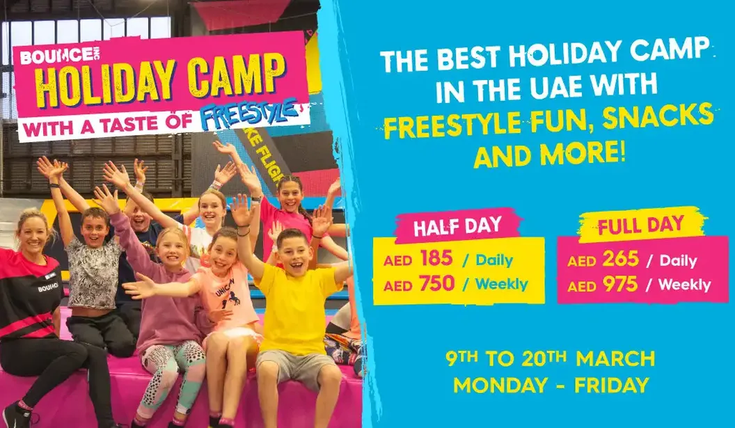 The Holiday Spring Camp at BOUNCE is the ultimate way to beat boredom during the holidays. Exclusively designed for your kids aged 4 years and up, they will be fully supervised every day, while they explore BOUNCE’s awesome facilities. BOUNCE Holiday Camp packs a punch with the best mix of play time and learning, all while making great new friends! ------- ACTIVITIES TO EXPECT ------- - Freestyle Activities - Parkour Training - Variety of Games - Trampoline Challenges - Loads of adventure and fun - Dedicated Hosts - Lunch ------ CAMP SCHEDULE ------- March 9-20, Mon-Fri Half Day: 8AM - 1:30PM Full Day: 8AM - 5PM ------- The camp is available at all BOUNCE locations across the UAE