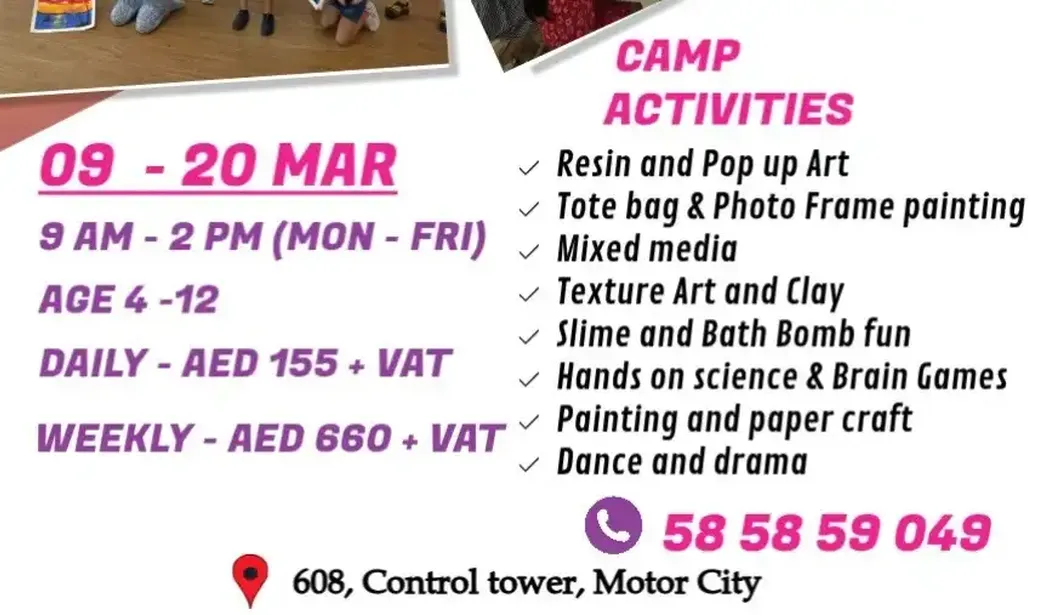 Looking for a hands on, imagination fueled spring break experience? Mind Marvel’s Spring Camp is the perfect place for young creators to explore, experiment, and express themselves through art and innovation. ---- Morning Camp ---- - Timings: 9:00 to 14:00 - Ages 4 - 12 Activities Include: - Resin & Pop-Up Art - Tote Bag & Photo Frame Painting - Mixed Media & Texture Art - Clay Creations - Slime & Bath Bomb Fun - Hands-On Science & Brain Games - Painting & Paper Crafts - Dance & Drama ---- Pricing ---- - AED 162.75 Daily (Including VAT) - AED 693 Per week (Including VAT) ---- Afternoon Camp ---- - Timings: 15:00 to 18:00 - Ages 8 - 15 Activities Include: - Candle Making - Soap Making - Pour Painting - Resin Art - Tie & Dye T-Shirts - Tote Bag Painting - Mug Painting - Jesmonite Creations - Texture Art - Knife Painting - Canvas Painting - Watercolor Art - Coffee Painting ---- Pricing ---- AED 220.5 Daily (Including VAT) AED 934.5 Per week (Including VAT) With a strong focus on hands-on learning and creative exploration, Mind Marvel’s Spring Camp is the perfect place for children of all levels to express themselves, build new skills, and make lasting memories.