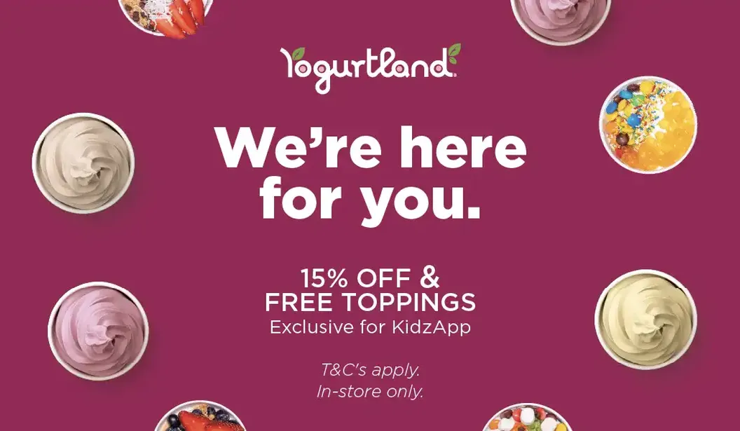 Make your visit even sweeter with an exclusive Kidzapp perk at Yogurtland! Show your Kidzapp digital voucher at any Yogurtland store and enjoy: 15% OFF your bill 1 FREE topping Minimum spend: AED 50 A fun and refreshing treat stop for families—perfect for customizing your favorite frozen yogurt just the way you like it.