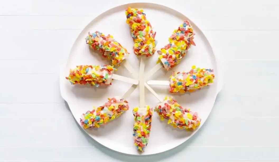 View LocationMake a quick, healthy dessert with your little ones that you can both enjoy making and eating together! --Ingredients-- 3/4 cup strawberry yoghurt 2 cups Fruity Pebbles cereal 4 medium bananas, peeled and cut crosswise in half 8 wooden pop sticks --STEP 1-- Place yoghurt and cereal in separate shallow bowls. Insert pop sticks through cut side of bananas. Dip bananas in yoghurt, then roll in cereal to coat. Transfer to waxed paper-lined baking sheets. --STEP 2-- Freeze until firm, about 1 hour. Transfer to airtight freezer containers; seal containers and return pops to freezer.