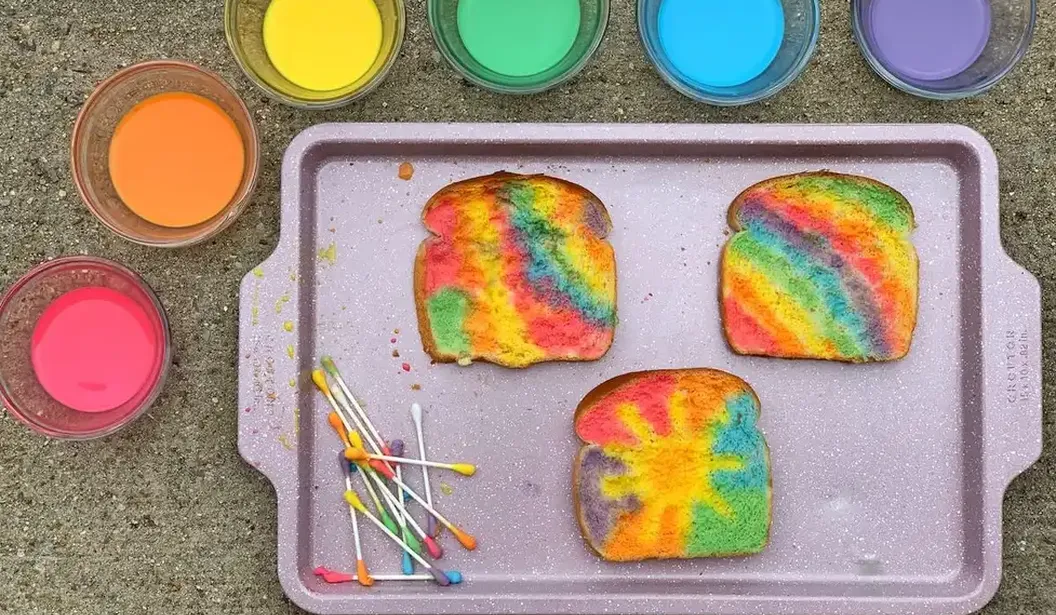 View LocationThis is a fun activity for your youngest and allows them to be creative while making a snack! --WHAT YOU'LL NEED-- Sliced white bread Milk Food coloring -- STEP 1 -- Mix a small amount of milk & food colouring -- STEP 2 -- Paint on bread (use a new and clean paintbrush) -- STEP 3 -- Put in the toaster (if not too wet) or oven & eat ------ Image credit: www.holleygrainger.com/