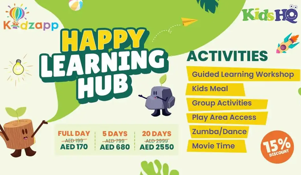 Looking for a safe, structured space where kids can stay engaged while school is online? Kids HQ’s Happy Learning Club is designed as a “drop & learn” experience, giving children a balanced day of learning, creativity, and play, all under expert supervision. Perfect for school term breaks (or those in-between days), this 5-hour program keeps little ones busy, social, and inspired while you get through your day stress-free. ---------- WHAT’S INCLUDED ---------- - 5-hour fully supervised drop-off program - Guided learning workshops (Arts & Crafts, Sensory Play, Basic STEM, Creative Building, DIYs) - Group activities and skill-based sessions - Play area access (including Star Mart role play) - Zumba/dance session - Short movie time - Wind-down storytelling session - Lunch included (Pizza or Nuggets, Fries & Juice) ----------- PRICING ----------- - Full Day: AED 199 - 5-Day Package: AED 799 - 20-Day Package: AED 2999 Validity: 2 months from date of purchase ---------- OPTIONAL ADD-ONS ---------- - Extended hours: AED 25 per hour - Take-home DIY kits: AED 20–30 ---------- ABOUT THE VENUE ---------- Kids HQ is a popular edutainment centre loved by families, featuring a massive multi-level soft play area with slides, trampolines, climbing zones, and interactive spaces. It’s designed to keep kids active, engaged, and entertained in a safe and welcoming environment.