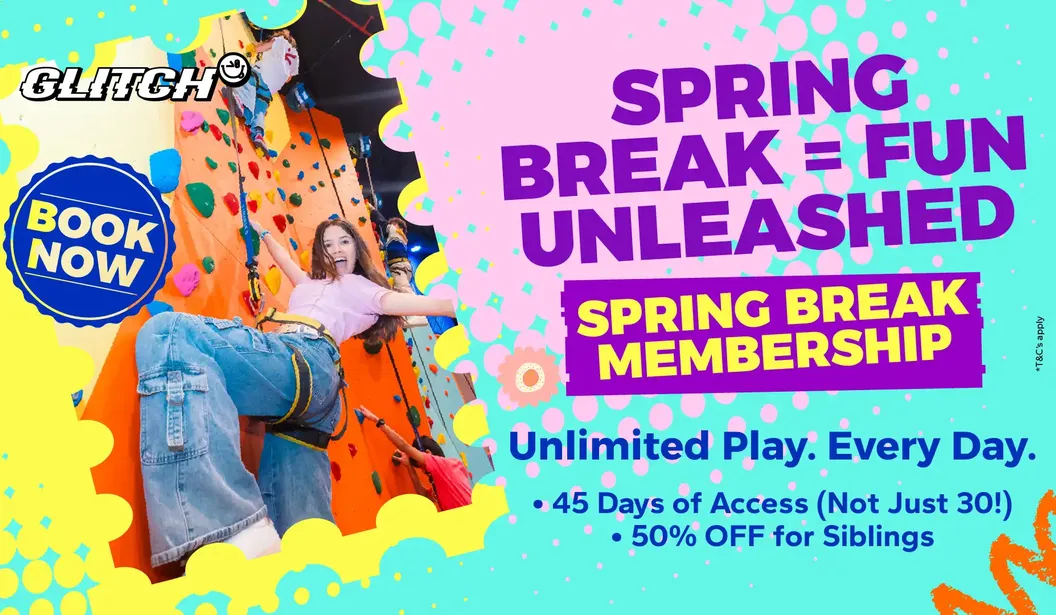 Make the most of Spring Break with Unlimited Play at GLITCH, one of Dubai’s largest indoor entertainment destinations. This special Spring Break Membership lets kids and families enjoy unlimited access to fun-filled attractions every day. Even better, the membership comes with extended validity of 45 days instead of the usual 30, giving families more time to return and play again and again throughout the season. With an exclusive Kidzapp offer, this is a great way to keep kids entertained during the school break while enjoying major savings. ---------- SPRING BREAK MEMBERSHIP BENEFITS ---------- - Unlimited play daily - 45 days validity instead of 30 - Valid on purchases made March 1 to March 19 ---------- EXCLUSIVE KIDZAPP PRICING ---------- - 1 Child Membership: AED 450 (25% OFF) instead of AED 600 - 2 Children Membership: AED 750 (50% OFF) instead of AED 1,200 **All other inclusions and benefits remain the same as the standard Spring Break Membership. ---------- ABOUT GLITCH ---------- GLITCH is a massive indoor family entertainment destination spanning over 40,000 sqft at Al Ghurair Centre, packed with 30+ attractions, arcade games, and an 8-lane bowling arena. Thrill seekers can try the city’s first indoor roller glider, Sky Surf, while adventure lovers can tackle attractions like Pandora’s Peak Cloud Climb, Jungle Scout rope obstacle courses, Newton’s Walls climbing challenges, and the Ninja Course. Add immersive VR games, arcade experiences, and bowling, and you have a full day of non-stop excitement. Whether you're planning a fun family outing, a birthday celebration, or just a day packed with activities, GLITCH delivers high-energy entertainment for all ages.