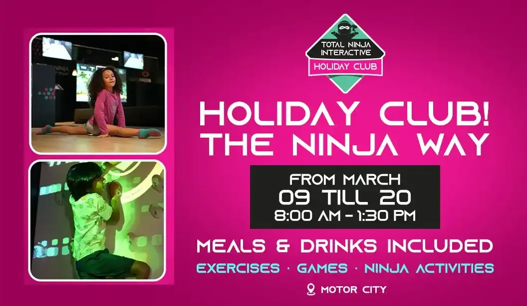 Step away from the screens and step into the world of Total Ninja Interactive! This Spring Break, kids will unleash their inner ninja through action-packed challenges, interactive gaming experiences, and exciting activities designed to keep them moving, engaged, and having fun. Our high-energy ninja camp combines ninja challenges, interactive VALO gaming, team activities, and creative stations to help young ninjas build confidence, coordination, teamwork, and resilience in a fun and dynamic environment. Each day is packed with exciting moments as ninjas jump, climb, balance, and take on interactive challenges while earning achievements and celebrating their progress. Whether they’re competing in friendly ninja games, exploring our interactive gaming arena, or completing daily ninja missions, this camp is all about movement, confidence, and unforgettable ninja fun. ----------- WHAT TO EXPECT ---------- - Ninja training sessions and fun tournaments - High-tech VALO interactive challenges - Creative Ninja activity station - Obstacle course adventures - Daily achievements and certificates ---------- WHAT'S INCLUDED ---------- -Meal and snack - Grip socks for ninja challenges - Supervised camp activities ---------- CAMP DETAILS ---------- DATES: March 9 to 20 (Monday to Friday) TIME: 8:30 AM – 1:30 PM LOCATION: Motor City – Joud Boulevard East, Dubai Motor City PRICE: AED 198 /per day (was AED 220) ---------- Let the kids jump, climb, and conquer exciting ninja challenges while making new friends this Spring Break!
