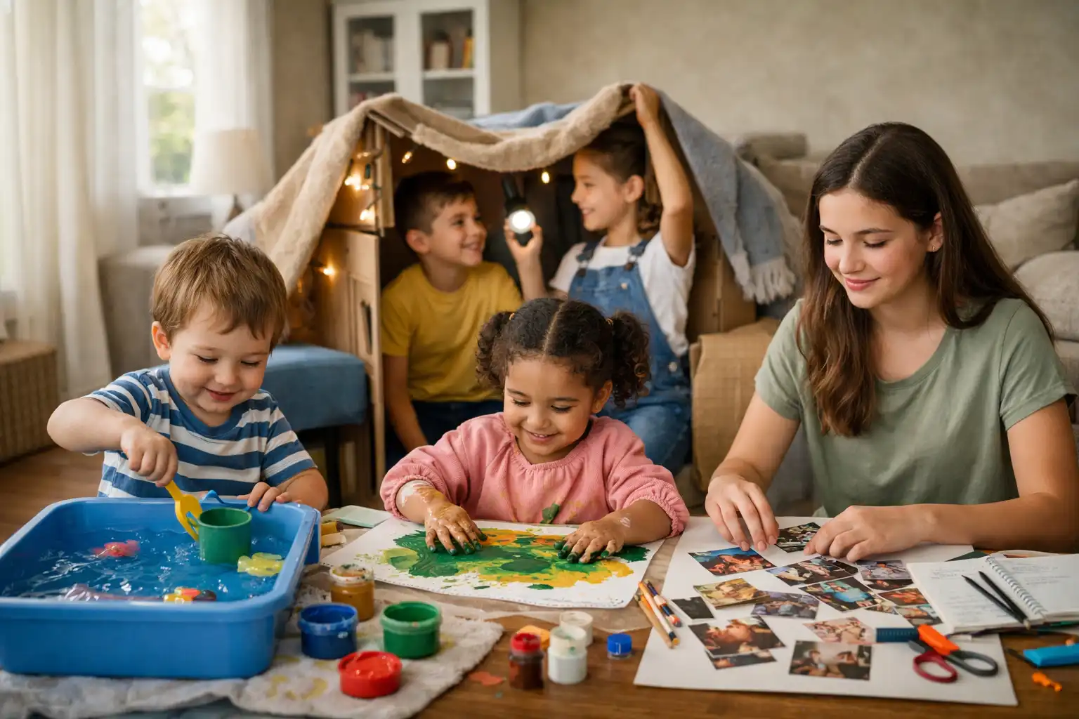 Creative setups also help. A small craft corner with paper, glue, and recycled materials can keep them busy for hours, especially when paired with open ended prompts rather than strict instructions. Fort building is another favorite. Using blankets, chairs, and pillows, they can create their own space and then actually use it, to read, snack, or play. Letting them lead makes it more meaningful.